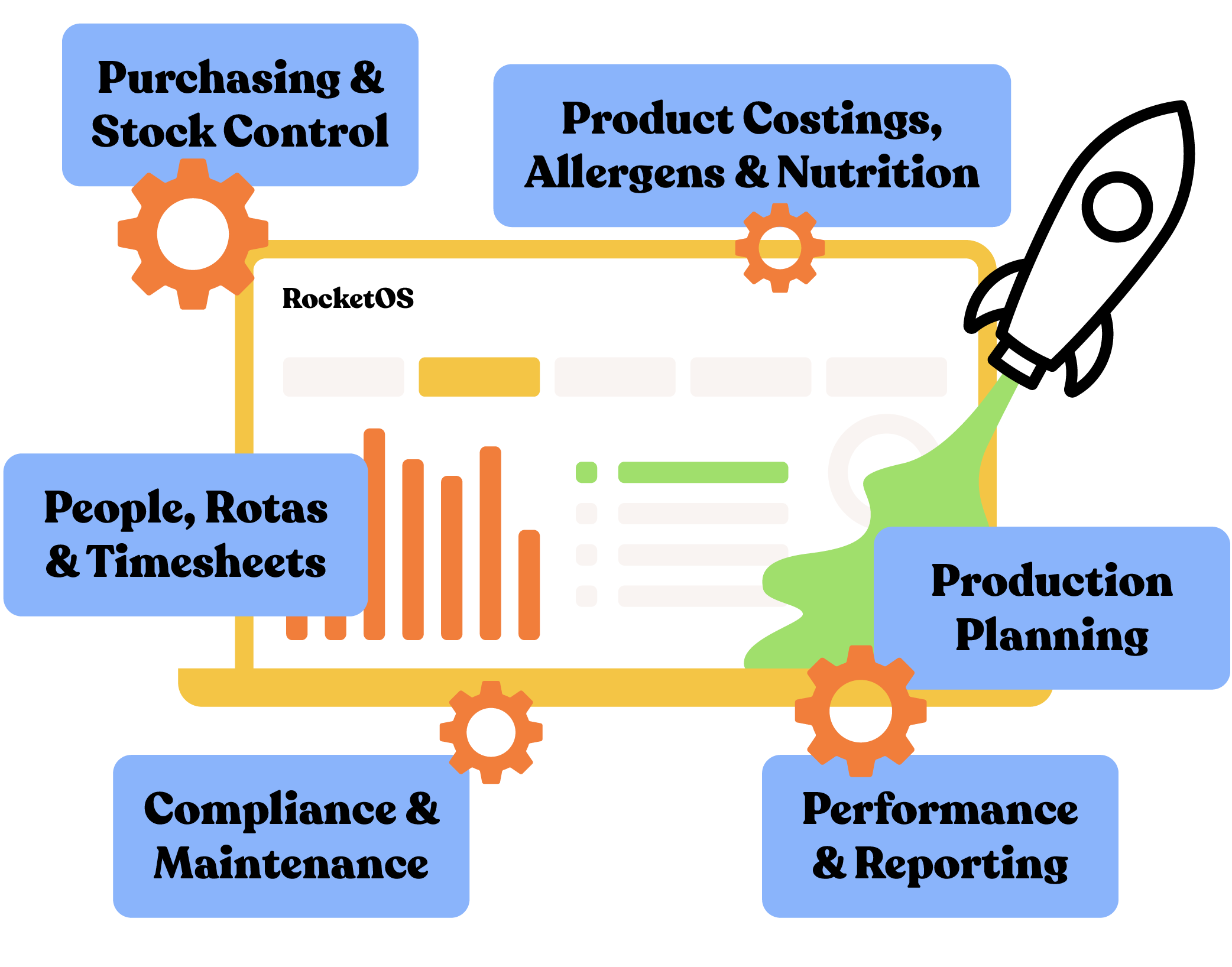 Bringing together purchasing, product, production, people, rotas & timesheets, compliance & maintenance and of course reporting and insights, basically everything except EPOS, RocketOS is all you’ll need to run and grow your hospitality business.