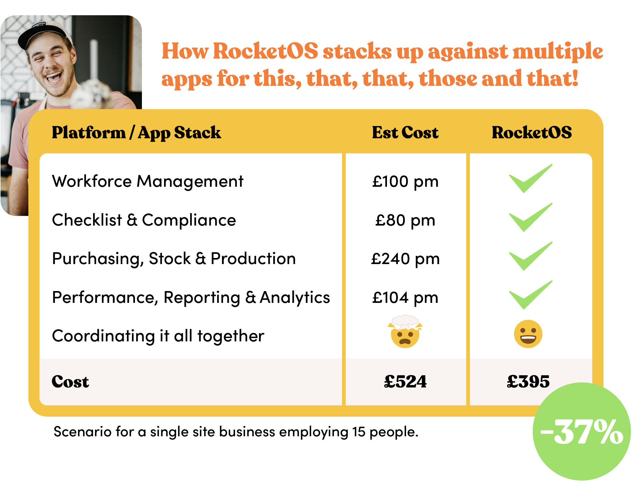 RocketOS saves you money on subscriptions and time spent co-ordinating between them. Drive productivity and efficiency across your business.